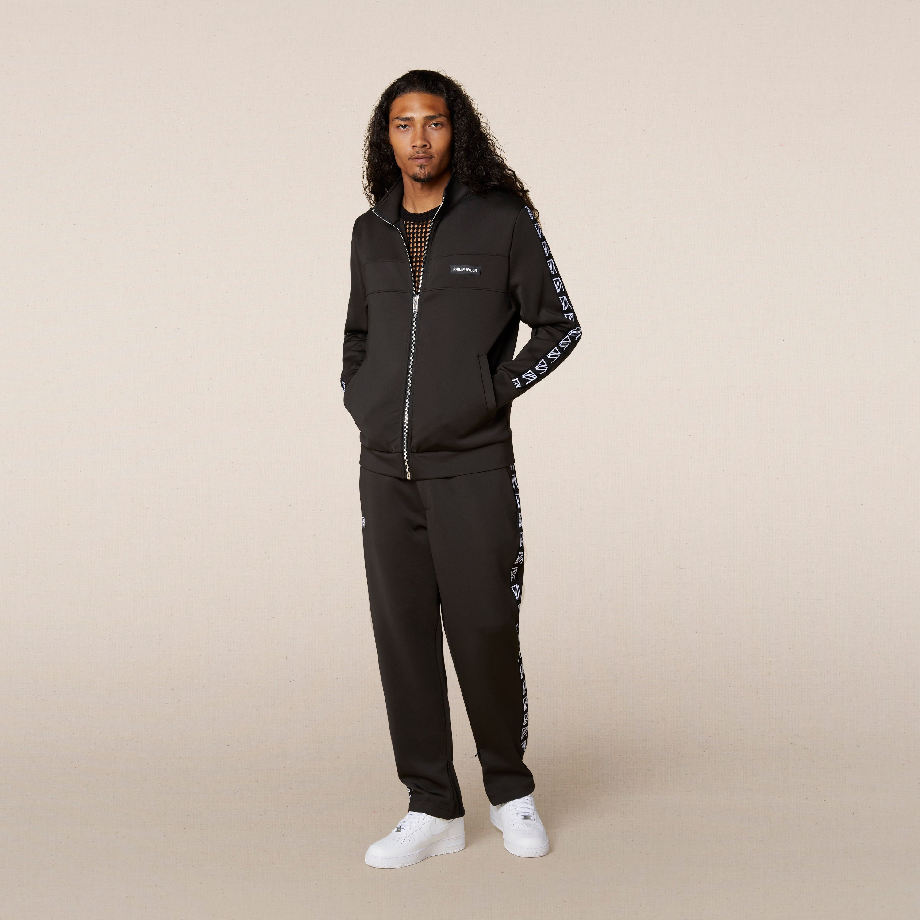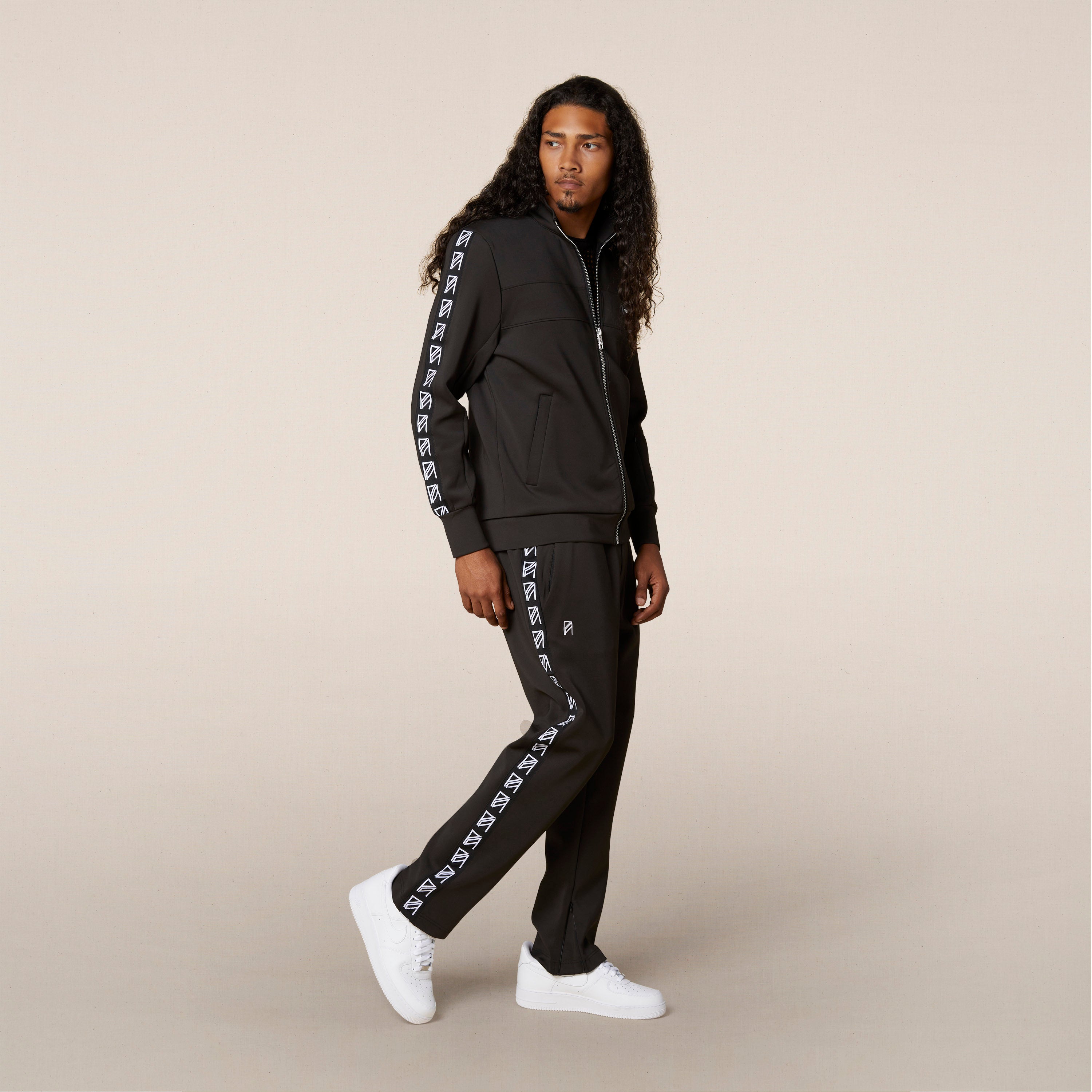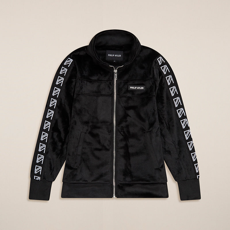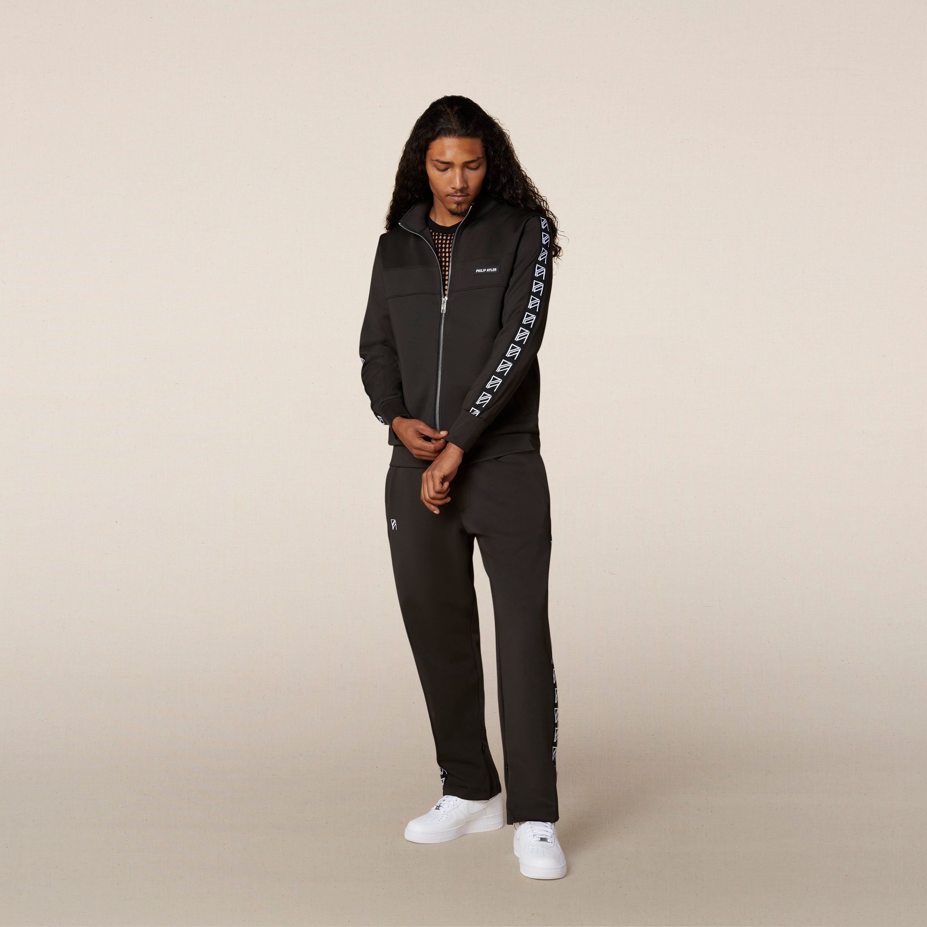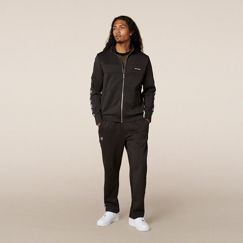 The Philip Ayler Signature Track Suit is a bold fusion of athletic heritage and high-end design. Crafted from an ultra-luxurious blend of cotton, polyester and spandex, it offers an exceptionally smooth feel with just the right amount of stretch for movement and comfort. The sleek, tailored silhouette is accented by a custom Philip Ayler logo taping running down the sleeves and pant legs. Designed with function in mind, the jacket includes zippered side pockets to keep essentials secure, while the pants feature expandable boot zip zippers with custom Philip Ayler buttons. The jacket is finished with a stand collar, full front glossy nickel zip, and signature chest patch.