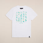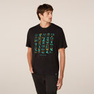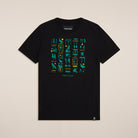 A graphic ode to ancient mysticism, the “Cartouche” T-Shirt showcases a grid of hand-drawn Egyptian hieroglyphs, anchored by a central cartouche symbol—traditionally reserved for the names of royalty. Rendered in luminous teal and goldenrod on deep black or clean white, this design whispers secrets from the past in a thoroughly modern voice.