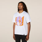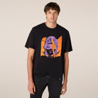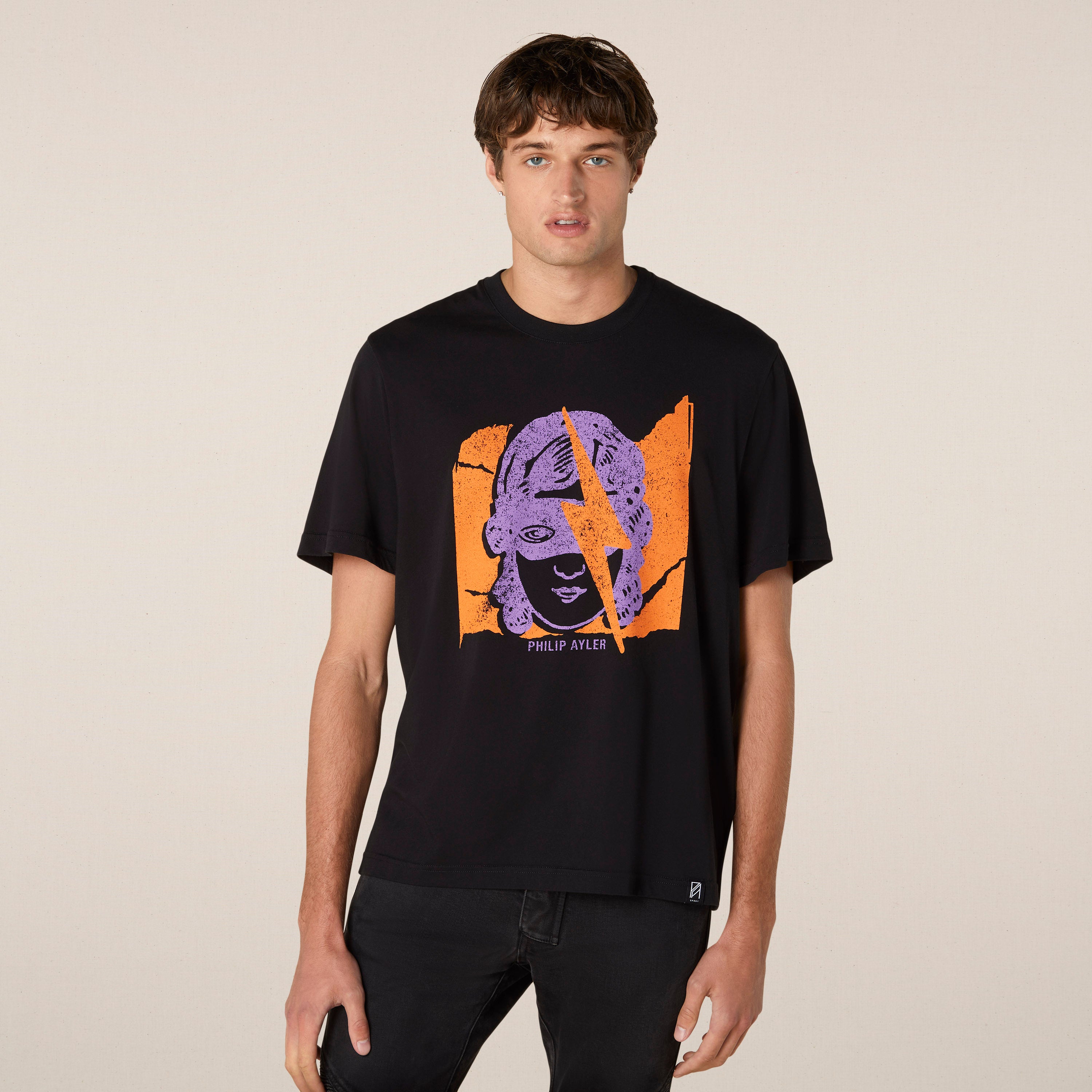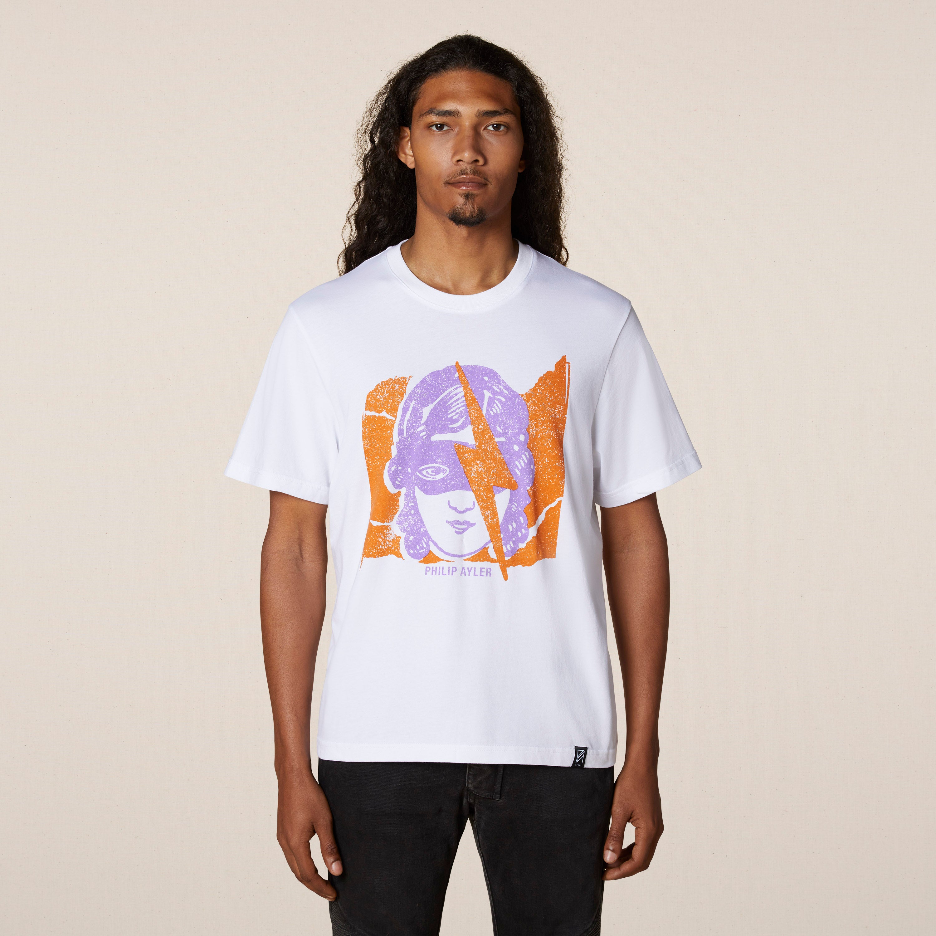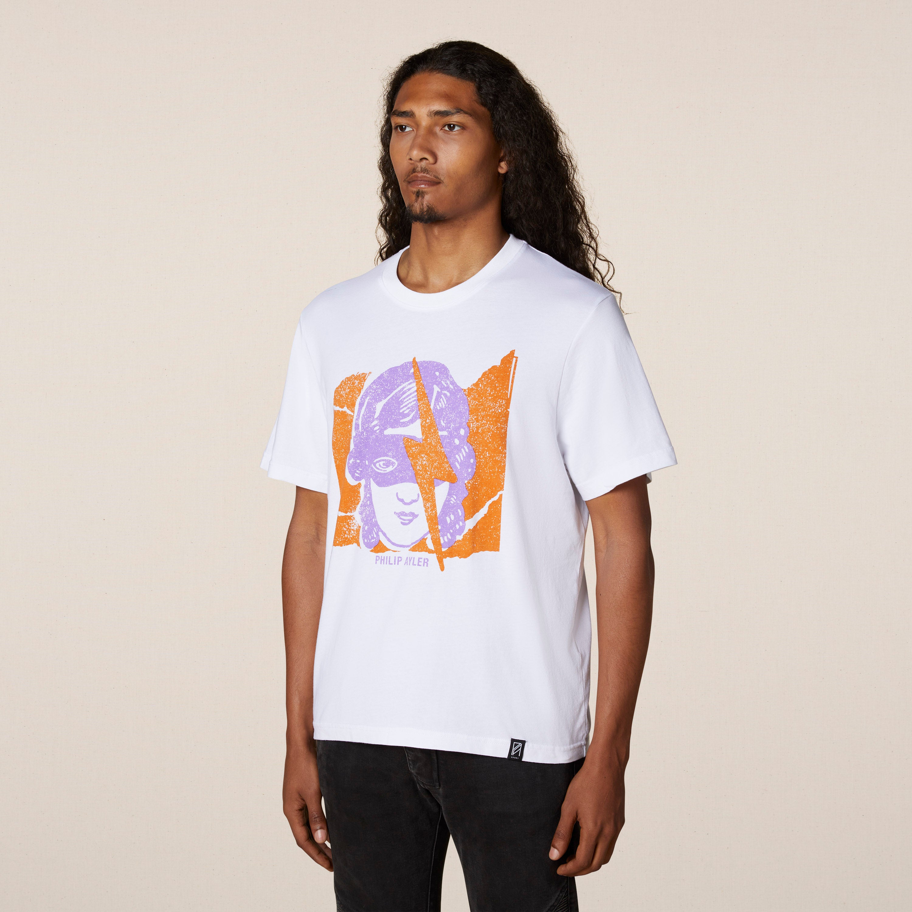The “Ziggy” T-Shirt by Philip Ayler strikes like a flash of iconoclastic energy. Featuring a masked head printed in bold violet, slashed with a jagged orange lightning bolt across one eye, the artwork nods to glam rock’s golden era while hinting at anonymity, rebellion, and reinvention.