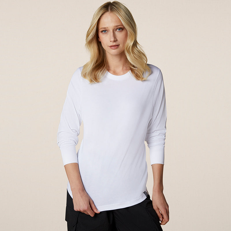 The Philip Ayler Women’s Long Sleeve Crew Neck has the perfect balance of softness, structure, and everyday elegance. Made from lightweight 160 GSM American-grown Pima cotton, prized for its extra long staple fiber. This elevated essential feels luxuriously smooth with a flattering, feminine drape. Designed to move with you from morning to night, it features a slim yet comfortable silhouette, clean cuffs, and a subtle woven hem label. Available in classic black and crisp white, it’s the go-to piece for layering or wearing solo. Effortlessly chic, endlessly versatile, and crafted to last. This is the true wardrobe foundation.